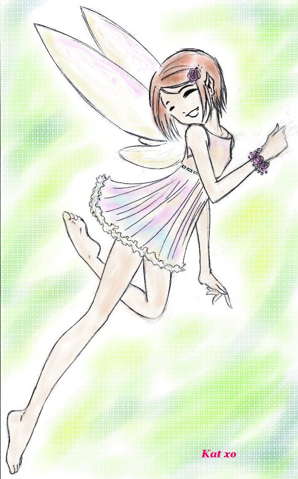 Takeru barely noticed when his brother moved past him down the hallway. Hikari. It was such a beautiful name. Its owner wasn’t bad, either, he decided, staring dazedly into soft brown eyes. The girl was wearing an unusual outfit – it was white, but it shimmered with a multitude of soft colors. The dress was caught by a small clasp at both shoulders, and had a slin ribbon tied through the material just beneath her chest, spreading in ruffles to reach to mid-thigh. A pair of graceful wings were extended behind her, looking a great deal like butterfly wings, and a small, flower-like clip held back her short brown hair. A thin ribbon encircled her left arm, near the shoulder, and a bracelet of tiny purple flowers was around her right wrist.