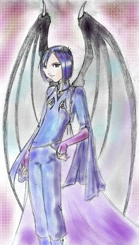 Noticeable immediately were the black wings spreading from the figure’s back – very unlike Hikari’s, in that they resembled bat or dragon wings. These were spread out either side, as if their owner had actually flown into the room from wherever the doorway led to. Hair that seemed dark blue where the light touched it framed a pale, fine-boned face. Large, slanted azure eyes seemed to dominate the features, adding emphasis to the flawless skin and the slight smirk that was his expression. Clothes with the shifting, shimmering coloring of Hikari’s, though dominated by deep blues and purples rather than soft pinks and whites, encased a deceptively slender frame. The cut spoke clearly of a position of power. High collar, lined with stiff silver and with small gems built into the material. Full sleeves cut at the elbow to trail loosely with his arm but to expose the tightly fit sleeve that, like Daisuke’s, ended in a point over his knuckles, trimmed elegantly with silver. The shirt ended just above his hips, and loose pants flowed to where supple boots obviously intended for formal wear began. Attached to his overshirt was a cape-like extension that billowed slightly behind him.